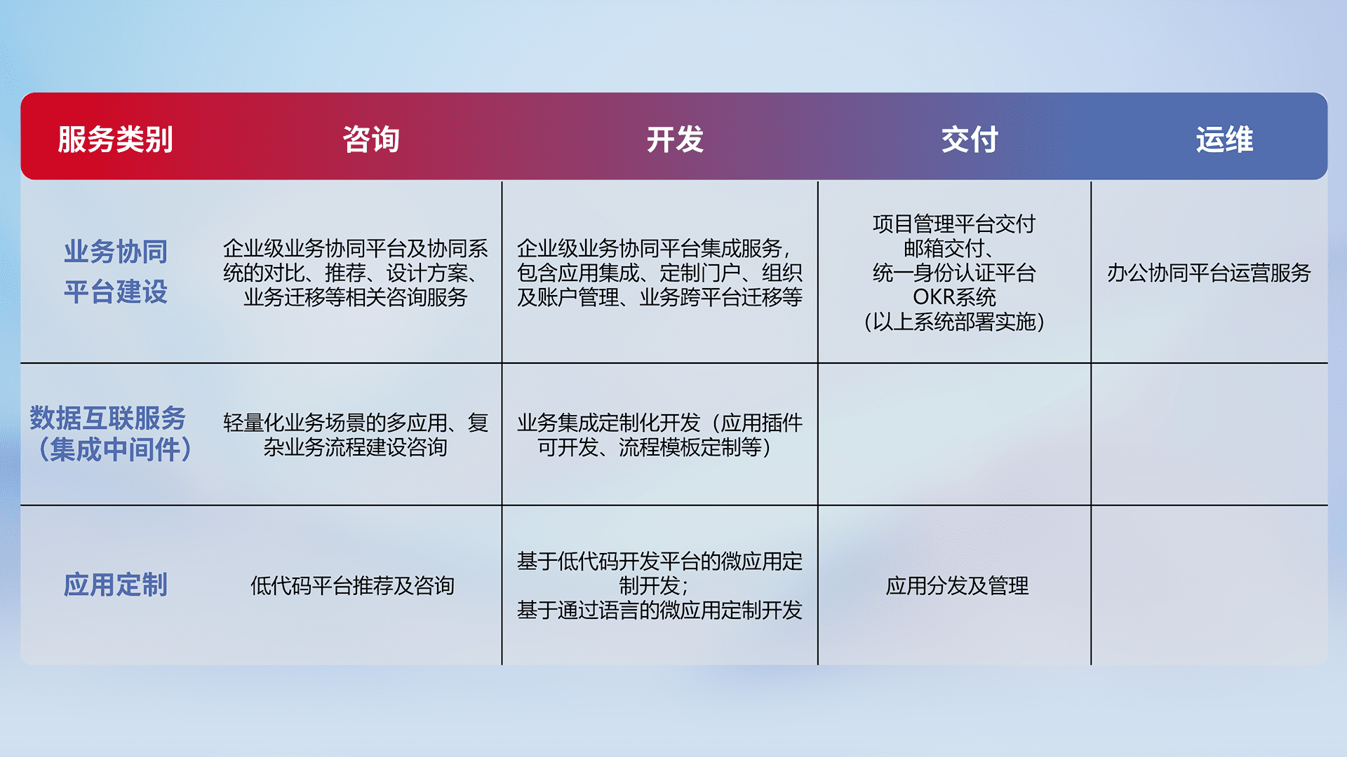 针对钉钉、、企微、、、IDaas等平台级产品提供产品的规划、、、方案、、、、交付、、定制化开发等服务,,,,实现如统一协同办公、、、、智能客户服务、、、混合会议管理、、、、智能数据查询、、、等业务场景,,,实现数字化转型。。