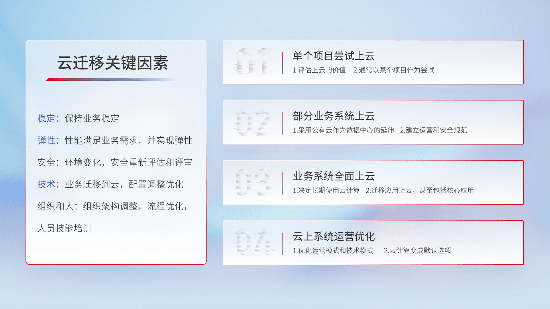 结合实际业务,,,,从规划设计、、云平台选型、、、、云原生改造、、、、数据迁移、、集成交付,,迁移全过程为客户识别最佳上云路径,,,,做好风险识别管理,,设计网络架构、、、、身份权限、、安全审计合规、、、操作审计、、、日志审计、、监控告警策略、、、多站点容灾设计等,,,对云上基础设施进行整体规划,,,提升IT治理水平,,以满足弹性、、、、高可用、、、、高性能的需求。。