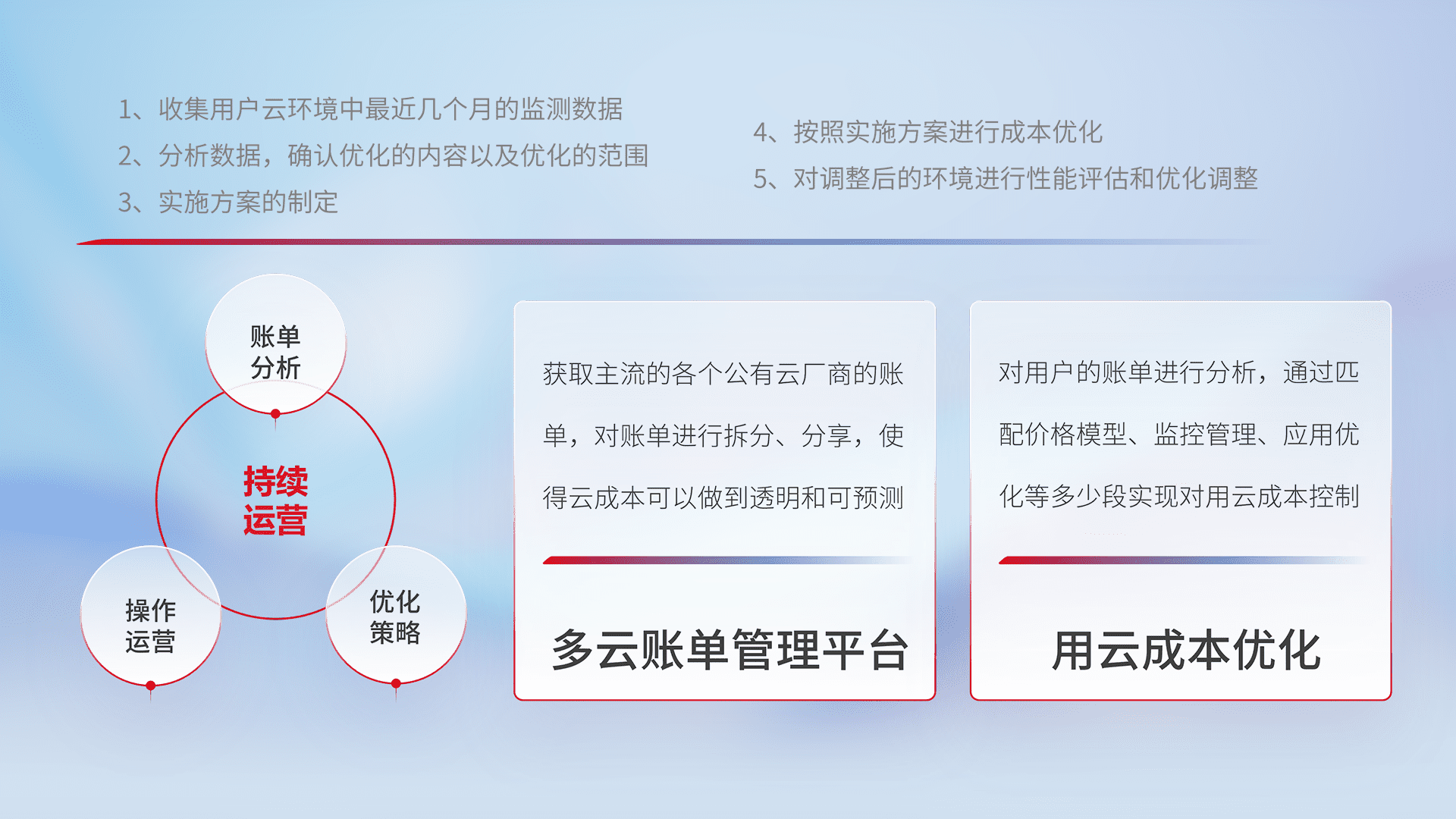 通过灵活运用多种自动化迁移工具,,,,帮助企业用户实现业务和数据高效 、、、稳定的上云迁移和云上迁移,,,,采用自研多云纳管平台,,,以中立管理模式,,,解决多组织、、、、多云、、、、多运维厂商的复杂关系的管理,,,保证多云平台资源配置的一致性,,实时掌控云资源运行数据,,,,运用智能化工具分析云资源多云平台的管理服务,,,,透明化管理成本支出,,,,用云成本可预测、、、、用云费用可优化、、云资源配额有据可依。。。。