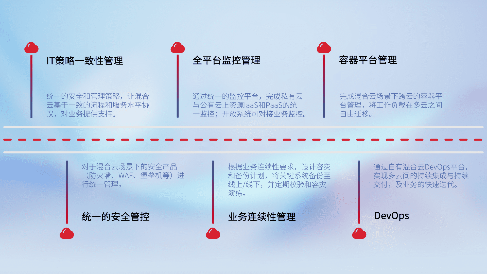 通过多云纳管,,,,以统一的资源数据模型把客户的云资源进行抽象和封装,,,进而实现对多云资源的统一操作,,保障云资源管理的可靠性、、稳定性与可用性。。。。量身定制化运维内容,,,,配置、、、开发运维、、补丁管理、、、、备份、、、、监控、、、认证和访问管理、、、、审计和日常巡检等,,,保障在用云过程中的可靠度,,,稳定度以及高可用率。。。。